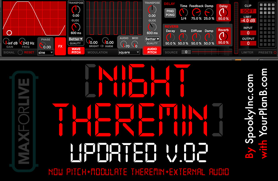 | Description: | VERSION 2 VERISON 2 This is a huge update to our Night Theremin We've added the ability to transpose both the Theremin signal and the incoming external audio from either an instrument or audio. This updated M4L device can be played like an instrument on a Midi track (if you don't add any instrument) with a Miid keyboard or device slot notes in the piano roll. It can be used as an audio effect on a Midi track with an instrument. And it can also be used as an audio device on an audio track. In the Source column, you can bring back in the dry external audio signal. I've made a video to show what this sound design instrument can do... https://youtu.be/m9vegpEkTB0 VERSION 1 We’ve been working on this audio M4L device for awhile now, and are finally excited to release NIGHT THEREMIN+ (Plus). At first it works like a basic Theremin - move the slider to adjust volume and pitch (frequency) for a sci-fi sound - complete with a visual graph of your signal. Right there on that initial screen, you can also add an undulating Phase to the signal, or change the signal wave all together by changing the wave shape from Sine, Triangle, Square, Saw+ or Saw-, pulse or noise. Push your out of this world sound even further by pressing the FX button, revealing more ways to modify your sound - the carrier wave. Add amazing changes adding brightness and harmonics to the carrier signal - with its own individual scope. Further sculpt your sound with a separate carrier wave, complete with it’s own wave shape selector. One of the things I really wanted to see was a way to adjust an incoming audio (from a clip or another track or a microphone). This was one of the challenges I set for myself with NIGHT MOD and was finally able to add a way to modify incoming sound source. Just turn the Audio and Mod dials to send the incoming audio signal through the carrier wave - meaning the incoming audio is also effected by the second (carrier) wave type for some crazy sound design possibilities! NIGHT THEREMIN+ can also be added to a Midi track to manipulate the incoming sound from the instrument through the carrier wave (just remember to turn up the AUDIO dial in the carrier wave’s Modulation window. While still experimental, if no instrument is loaded, you can “play”the Theremin+ with your midi keyboard/device. The semitone adjusts the Frequency and the Velocity of your playing adjusts the gain (volume). As far as I can tell, the audio signal input is disabled when on a Midi track. (If anyone knows how to do this, feel free to let me know and I’d be happy to add it). To add that out of space sound, we first added a digital Delay with a step delay (pushed to a full 2 bars). Secondly, we added the ever important Reverb to really add some space or take you to outer space. Both have a Dampen dial to round out and adjust the strength of the sounds. (Note: If you can’t hear the delay, try toggling the PING PONG button to reset the delay) Rounding it off, and to keep from clipping and blowouts that are common to Theremin playing, we’ve added a limiter at the end of the chain - including a hard or soft clip option, depending on the sound you’re looking for. Being able to see both the signal and the carrier waves, and how your adjustments are modifying the sounds was important to me so I made sure both scopes were large and easy to read. And as always, NIGHT THEREMIN PLUS has been designed to match seamlessly with our NIGHT SERIES classic retro design - with bold reds on a black background for that iconic 80s style. There seem to be endless possibilities with this device. We’d love to hear what you come up with, feel free to share with me and I might post it to SpookyInc socials or even YouTube Thanks for downloading NIGHT THEREMIN PLUS Hear some samples of what's possible... Shoe Gaze https://youtu.be/jPLp4nFQ5Ac Choir https://youtu.be/EYoY36omg6E Beat Drop https://youtu.be/QJi-V1VWZes |