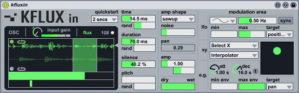| Description: | Kfluxin is a Max For Live audio effect device for granulation of sound. It's very easy to use : it has a friendly user interface and detailed descriptions for each function or parameter. It is possible to load audio samples by drag and drop, or well to record audio from the track. Kfluxin has two independent buffers and a lot of modulation stuff! Thanks to the Max For Live total integration, each Kfluxin parameter is fully automatable in the Live timeline. No external Max objects are used in Kfluxin. It comes unlocked! Some presets from Kfluxin : http://soundcloud.com/k-devices/kfluxin-presets RELEASE NOTES v1.2 (Jul 16th 2013) - Fixed a bug that may cause crash on load for Kflux and Kfluxsy (for Live 9 version) - Improved integration with Ableton Live Skins and graphic optimization (for Live 9 version) - Introduced parameters index for Push (for Live 9 version) |