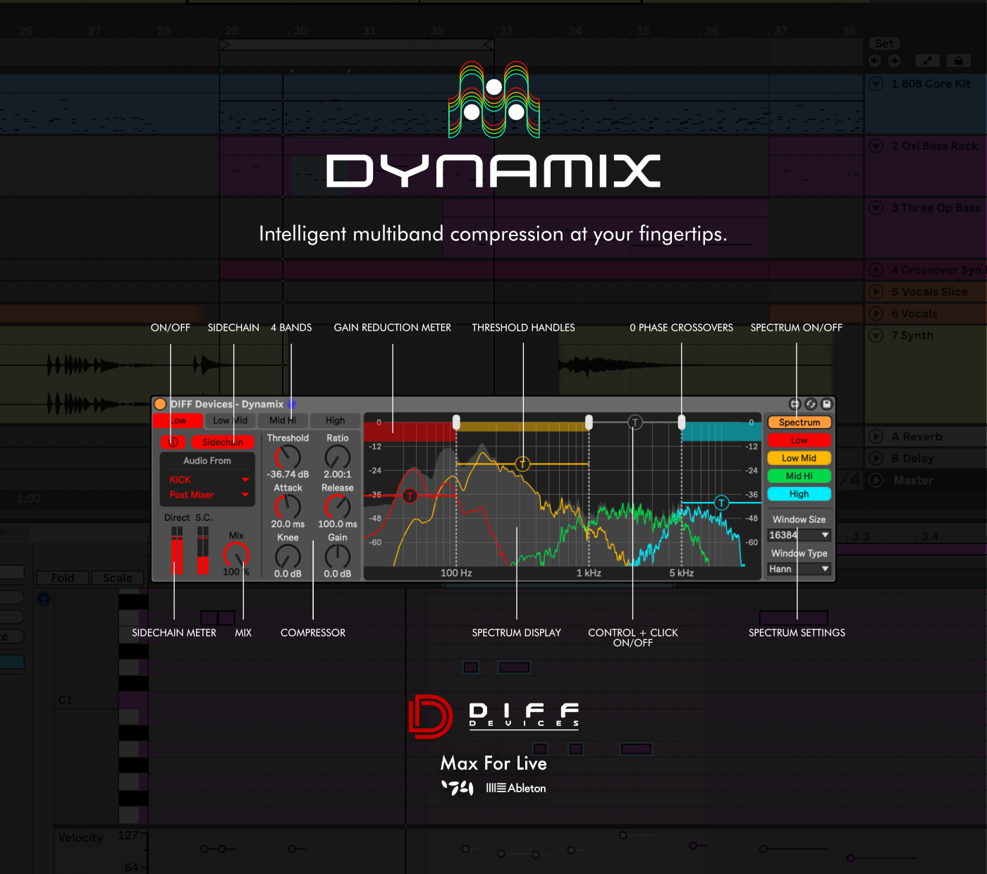 | Description: | DYNAMIX is an advanced Max for Live device designed to deliver intelligent multiband compression with precision and ease. Seamlessly integrating into your Ableton Live workflow, Dynamix provides powerful dynamics processing with four adjustable frequency bands, zero-phase crossovers, and intuitive visual feedback. Whether you're tightening up a mix, adding punch to drums, or achieving a perfectly balanced master, Dynamix gives you the control you need. Featuring real-time spectrum analysis, sidechain capabilities, and customizable threshold settings, this tool ensures your sound remains clear, dynamic, and professional. Take full control of your compression with DYNAMIX – the ultimate tool for producers and sound designers who demand high-quality, transparent multiband dynamics processing. FEATURES: • Multiband Compression – Four adjustable bands (Low, Low-Mid, Mid-High, High) for precise frequency control. • Intelligent Gain Reduction Meter – Real-time visual feedback on compression levels. • Threshold Handles – Easily adjust compression thresholds for each band. • Solo Individual Bands – Press Alt + Click on a threshold handle to solo a band. • Mute Individual Bands – Press Control + Click on a threshold handle to mute a band. • Reset Individual Bands – Double-click on any handle (including crossover bands) to reset. • Zero-Phase Crossovers – Maintain phase integrity for transparent audio processing. • Sidechain Input – Route external audio for dynamic ducking effects. • Spectrum Display – Visualize the frequency spectrum and compression impact in real time. • Spectrum On/Off Toggle – Customize your workflow by enabling or disabling the spectrum view. • Customizable Spectrum Settings – Adjust window size and type for accurate frequency monitoring. • Comprehensive Compressor Controls – Fine-tune attack, release, ratio, knee, and gain for detailed compression. • Mix Control – Blend the sidechain signal with the original for precise dynamic shaping. • Seamless Ableton Live Integration – UI adapts to Ableton Live themes for a cohesive experience. -- INSTALATION GUIDE : Inside the zip file you have an file : 1. DIFF Devices - DYNAMIX.amxd 2. Save the .amxd file anywhere on your computer or in a folder that you previously saved your maxforlive devices. 3. Drag and drop the device into a midi track. 4. Click on save (on the right hand side of the window: with a 'floppy disk' icon)... (Check Ableton Manual.) 5. This will automatically save the device to your ‘User Library’ folder in ‘Places’ (the ‘head outline’ icon), and will also save a '.adv' file which can be used to store your favourite initial setup. 6. You’re good to go. -- SYSTEM REQUIREMENTS : • MAC & WIN • Only works in Ableton Live with Max installed. • It Requires Ableton Live V12 (minimum). • M1 Mac Compatible. |