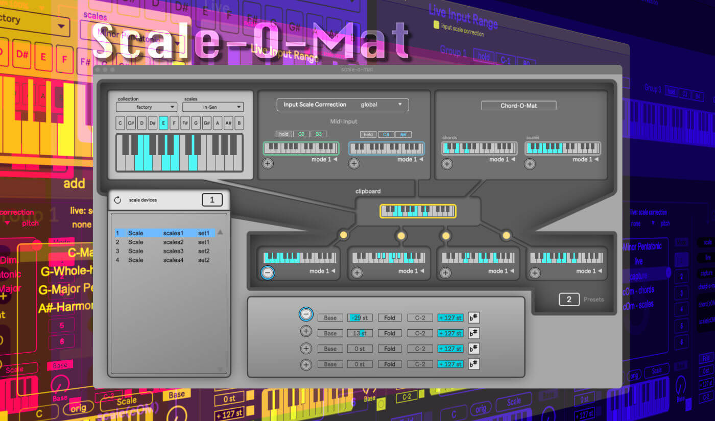| Description: | Scale-O-Mat - is a real-time scale control for Live Performance and Studio Production to have fast access to all your native Ableton Live Scale Midi Effects, which brings countless of possibilities & combinations of Scale Settings & Mappings. Scale-O-Mat lets you transform and constrain musical scales throughout your entire Ableton Live project, affecting multiple tracks. You can access all the native scales available in Ableton Live. The Scale-O-Mat device automatically detects all native Ableton Live Scale Midi Effects within your Live project and communicates directly with the one you have assigned. With Scale-O-Mat you can match a Scale or Chord to the native Scale Devices, transforming or filtering the incoming MIDI notes of different tracks. In addition to choosing scales, you can play them live using a Keyboard or Chord-O-Mat. This enables real-time transformation of scale matching and filtering. |