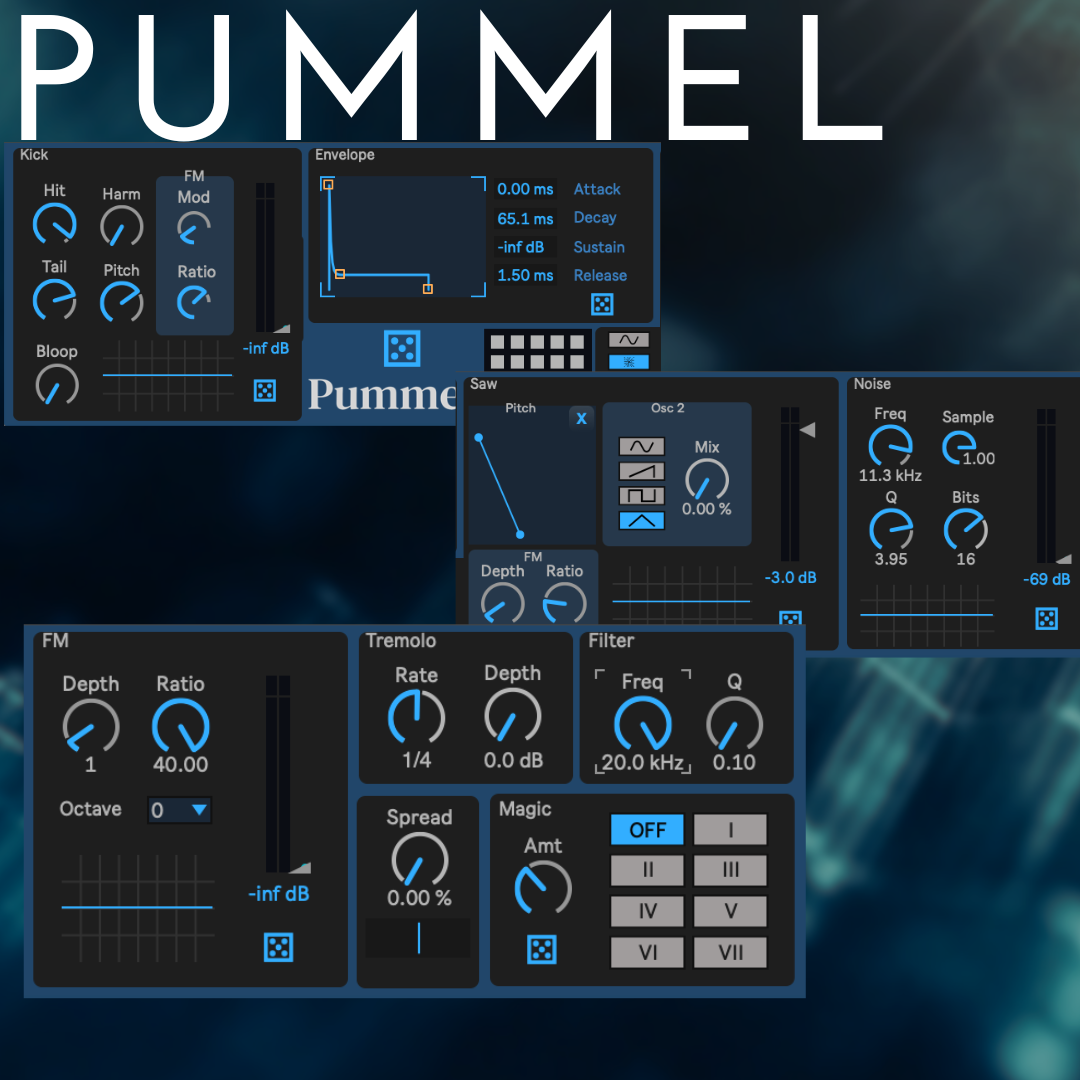 | Description: | Pummel is the dark and monophonic brother of my previous FM synth, Plume. Pummel was designed in a different way - not as a device to be used in a singular way - rather, as a playground for all things dark, low and aggressive. Pummel is capable of generating heavy kick drums, synth bass, hits, and all types of evolving noises. Pummel invites you to experiment. Twist knobs that you're not sure of. Add in other modules, or remove them. Randomize buttons on each module and a global randomize button allow you to find happy accidents, turn sounds into new sounds, and just generally explore and find new inspiration quickly. Pummel has many modules and I recommend that you don't necessarily use them all at once. Use what you need. Pummel includes the following modules: Kick drum generator Saw bass synth (with selectable second oscillator) Noise generator FM synth The Magic panel with seven carefully crafted modes to bolster, twist and ignite your patch Tremolo, spread and a filter for final polish While the kick drum has its own controls for the length of the tail, the rest of the modules share a common volume envelope to allow the different textures to act as one cohesive sound. The saw bass module also includes a drawable pitch envelope - allowing this module to also function as more of a 909 style bass drum, if you wish. There are also frequency modulation controls to be found in both the kick module and the saw bass module, allowing metallic and other-worldly sounds - not to mention the third instance of FM in the FM module. Because FM is lovely. Then we have some effects: tremolo, stereo spread, a filter, and, of course, the Magic panel. If you've used my previous synth, Plume, you'll be familiar with this already. The magic panel consists of seven modes, each of which with its own formula of mangling, flanging, crushing and more. The amount knob will behave differently depending on which mode is selected. For some modes, it will increase distortion while filtering parts of the signal. Other modes you'll find its increasing the feedback of a flanger, while other modes you'll hear some frequency shifting, some rhythmic chopping, etc. While Pummel can make many nice sounds without the Magic panel engaged, it can also make many gnarly and aggressive sounds with one of the seven Magic modes turned on. Experiment and be rewarded. Also, please note that since Pummel responds to the notes played, ensure you're playing a nice low octave note if you're looking for a kick drum or bass sound, and, of course, higher notes for less bass-y things like leads, plucks, snares, blips and bloops. Again, I really want to stress that this device is to be thought of as a playground. You don't have to engage all the modules to create a sound. I just wanted all these certain "tools" to be available to a producer - choose wisely and create what you wish, or hit that randomize button and mangle the sounds until it's what you wished for. As always, your purchase includes free updates for life. Also, I strive to provide extremely fast and thorough customer service. If you run into any issues installing or otherwise, reach out and I will ensure you're taken care of. ✌️ I'm a one-man team, doing this on the side while raising a very cool little toddler with my wife, and your support means the world to me. Change log v1.1 - Fixed an issue where the Pitch envelope for the Saw component would not save when storing a patch. Also fixed a few UI inconsistencies where colors would change incorrectly when switching between certain Live themes. |