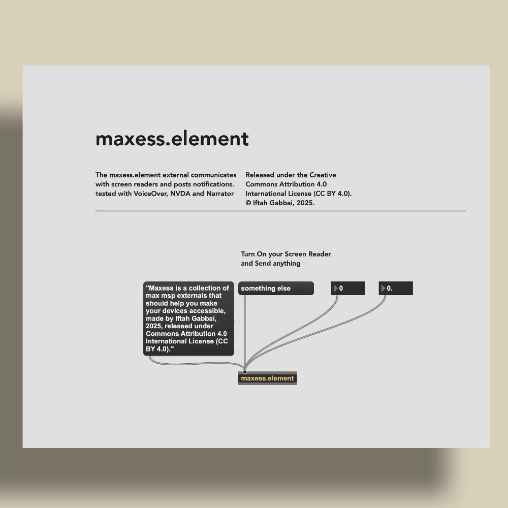 | Description: | Maxes is a collection of Max/MSP externals for macOS and Windows, designed to simplify the integration of accessibility features into your M4L devices. watch a walkthrough here https://youtu.be/Da6nElcbBe4?si=BVs_X0UYHprT75X9 - maxess.element enables communication with screen readers. It has been tested with VoiceOver, NVDA, and Narrator. - maxess.keyboard captures keyboard input, even when the containing window or application is out of focus. - maxess.speech interfaces directly with the operating system's native speech synthesis engine. - maxess.file facilitates interaction with the file browsing system, addressing the limitations of "opendialog," which currently does not work with screen readers on macOS. |