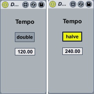 DoubleTempo is a simple utility with one MIDI-mappable toggle button to double resp. halve Live's global tempo.