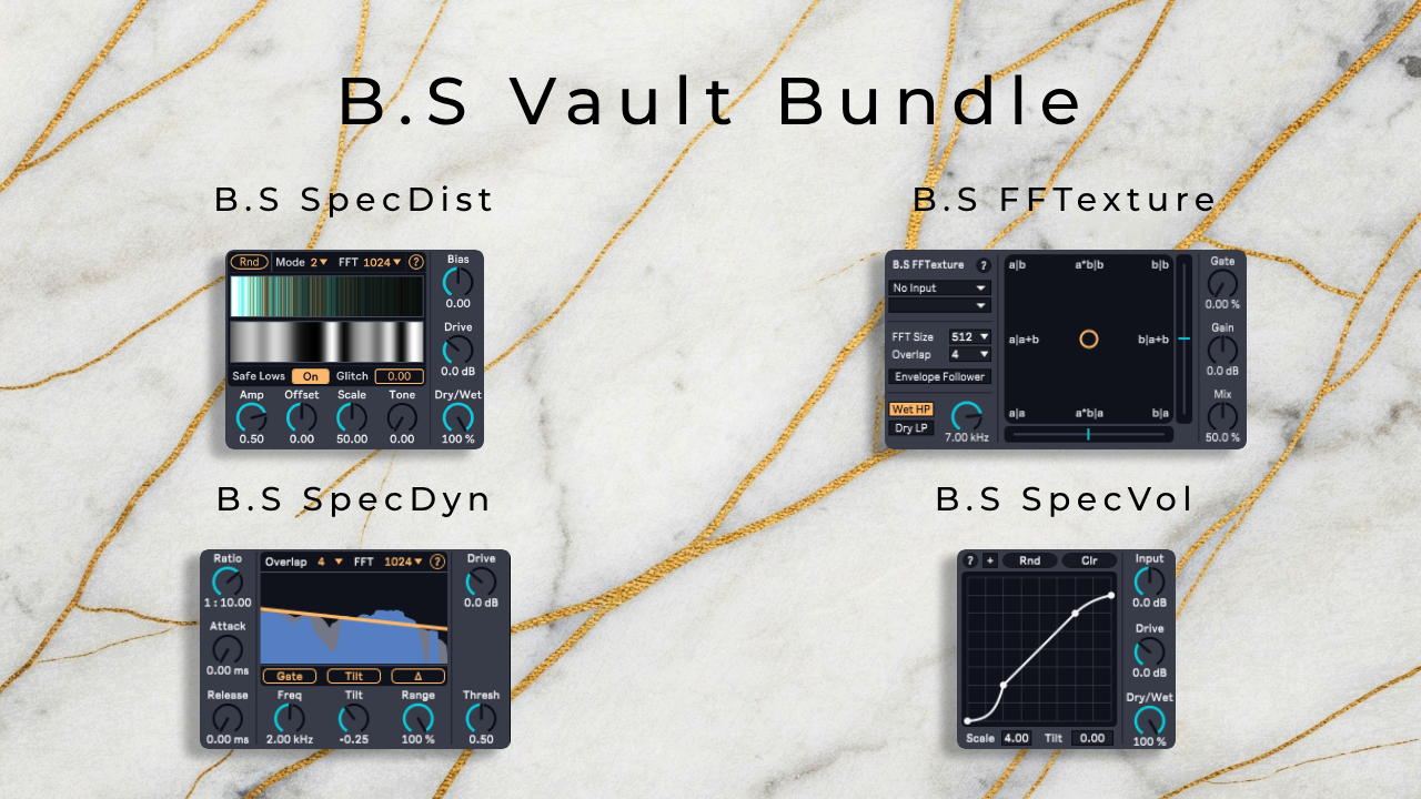 | Description: | This is your gateway to our entire library of innovative Max for Live devices, including everything we've released to date. On top of that this bundle grants you exclusive early access to release-ready M4L devices that are just awaiting their final touches. Be the pioneer, shaping your music with innovative tools before anyone else gets them. Every new M4L device we create will be added to this bundle, offering exceptional value and a great bang for your buck. Think of it as a one-time purchase that continuously grows, increasing its value over time and lets you grow your toolkit over time at no extra cost. Ready to experience the full potential of our M4L creations and stay ahead of the curve? Support and Tutorials: Still unreleased devices won't have manuals or tutorials available, inviting you to explore their potential. However all device parameters have detailed descriptions in Ableton's help view to guide your exploration. In case you are stuck, have a question or have issues with any device you can message us anytime and we will do our best to help you out. Contents: Here is a list of all Max for Live devices currently included in the Ultimate B.S Vault Bundle. Spectral: B.S SpecVol - Innovative Spectral Dynamics Effect B.S SpecDist - Spectral distortion and sound mangling B.S Spectral Delay - Powerful and diverse sounddesign tool (Unreleased) B.S FFTexture - Powerful texturizing and sound morphing tool (Unreleased) B.S Spectral Filter - Freeform Filter Designer (Unreleased) B.S SpecDyn - Intuitive spectral gate and compressor (Unreleased) B.S Spectral Dynamics - Advanced surgical spectral dynamics processing (Unreleased) Distortion: B.S Waveshaper - Creative Distortion Playground with extensive visualization B.S Death Distortion - Simple Go-To Distortion B.S Infector - Ring mod based crunch distortion (Unreleased) B.S Square4Filter - Dual comb filter for bass processing (Unreleased) Pitch: B.S Comb Filter - Midi controlled tuned comb filter (Unreleased) B.S Midi Utility - useful midi tools (Unreleased) B.S Drunk Robot - Midi Humanizer based on random walks (Unreleased) B.S KeyQ8 - Midi remote control for EQ8 (Unreleased) Other/Utility: B.S Audio Utility - Enhanced Utility Device B.S MacroMorph - Morph through ableton racks with one knob (Unreleased) B.S Phase Smith - Phase alignment tool and linear phase lowpass/highpass filter (Unreleased) |