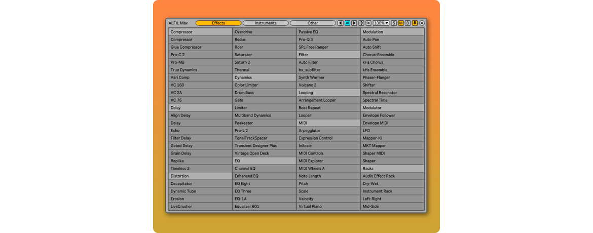 Description: ALFIL Max (Ableton Live Fast Item Loader) is a Max for Live device designed to speed up the workflow in Ableton Live. It allows you to load Live browser elements from a floating window, avoiding having to navigate through browser folders.