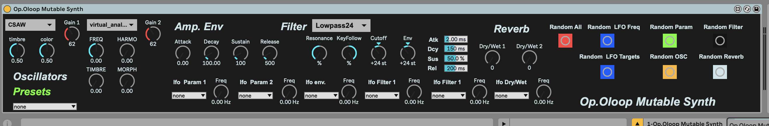 | Description: | Op.Oloop Mutable Synth is a combination of 10 voices of polyphony from Braids and Plaits. It also has an addition of a Ladder filter and five LFOs, also with random buttons to randomize all parameters or some groups of parameters. You can use it as classic Braids or Plaits or you can find very easy, interesting combinations of both with the addition of the filter by just clicking a totally random button. Also, it comes with 100 presets. Have fun! Buy: https://ko-fi.com/s/c62ab0a151 See: https://youtu.be/lTOtMhGuoCs The Op.Oloop Mutable Synth is added to the Op.Oloop Bundle: https://ko-fi.com/s/43778ff943 |