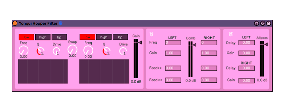 | Description: | This is a filter that separates processing for the left and right channel, each one with its own parameters. The Swap knob swaps the parameters settings between the channels. All the way to the left it is off. All the way to the right the parameters are swapped. In between, they become a mix of both. This section has its own gain Slider. Yonqui Hopper also includes an Allpass Filter and a Comb Filter. The Comb Filter has Frequency, Gain, Feedback and Feedforward parameters for each different channel. The Allpass filter has for each channel a Gain and Delay box. Both extra filters have their own Gain Sliders, working before the main filter in the chain. Play with different settings on all filters and discover what Yonqui Hopper can do. Have fun. |