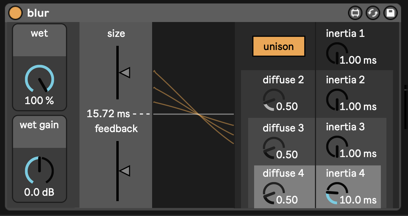 blur is a Max for Live stereo stereo audio effect device based on the iterative application of a 2-dimensional blur algorithm on an audio signal in the time domain, creating a cross between a low-pass filter, a multi-tap delay, a tonal reverb, and a complex feedback generator. Through its 72 delay lines, blur de-emphasizes subtlety in favor of smearing around undercurrents lurking in the audio signal. |