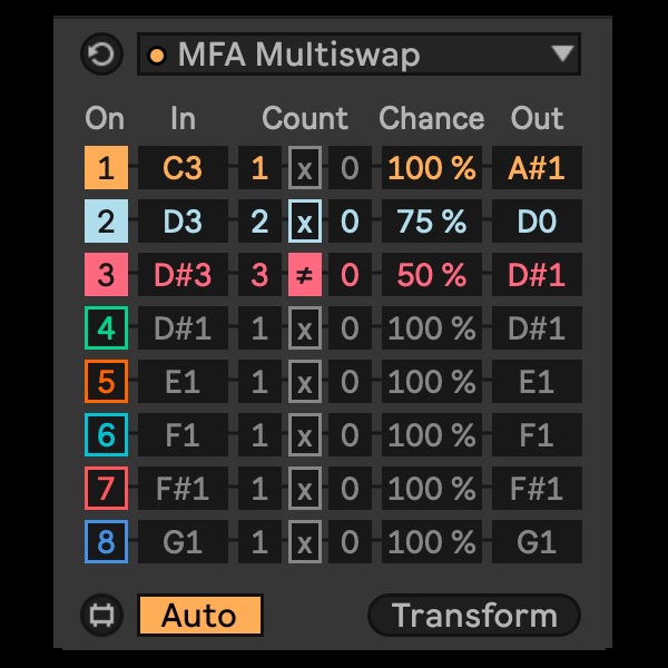 | Description: | Multiswap is a pitch remapping tool that transforms up to eight input notes into new target pitches, with optional probabilistic and count control for each transposition lane. By adjusting swap probability and count-based conditions—including every-nth note transpositions with invert and offset options—you can introduce subtle or radical pitch variation into existing MIDI material. With a default setting of 1-to-1 remapping, Multiswap behaves predictably, but combining probabilistic and periodic settings opens up a wide range of expressive, semi-random transformations ideal for evolving patterns and controlled variations. Already comes included with MIDI Toolset 003 and our MIDI Tool Bundle. Requires Live 12.2 running Max 9.x |