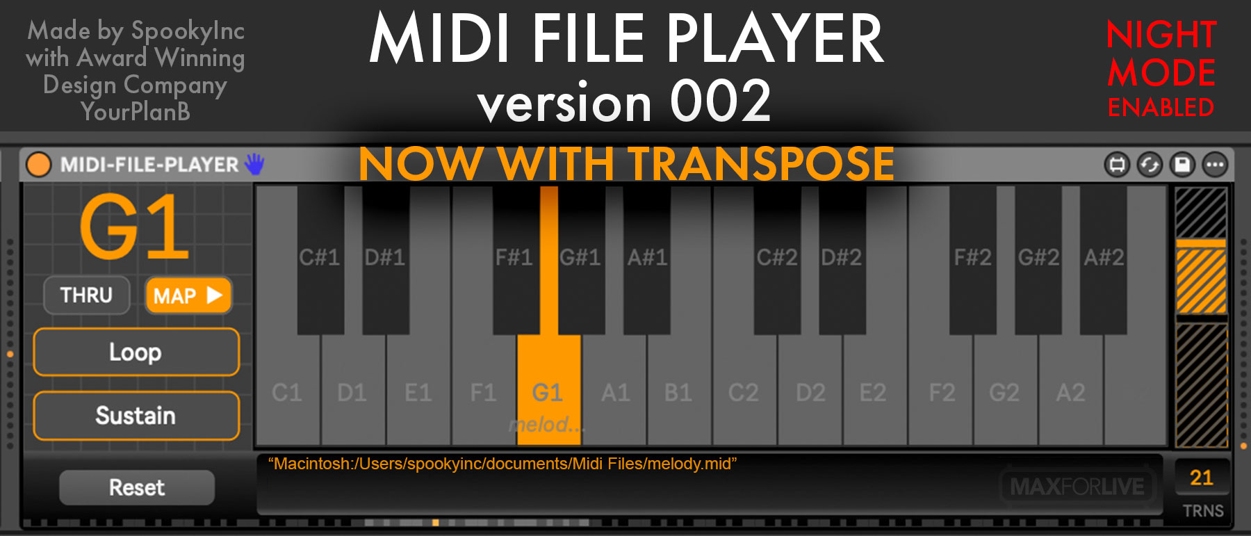 | Description: | Version 002 Want to see something cool? Thanks to the suggestion of one of our Midi File Player users, we just added the ability to transpose the midi notes being played! Thanks to a suggestion by one of our customers, users are no longer stuck playing the pattern of the note of the key slot you dropped your midi file onto! We were even able to offer transposing as the midinfile is playing. Just drop a file onto one of the piano keys, click hitting Sustain and Loop, trigger the note and play with the mappable Transpose slider to change the notes 36 semitones up or down! And in keeping with out NIGHT SERIES devices, we have activated Night mode on the Midi FIle Player, while keeping this device still very light on the CPU (between 0-1%). Just click the large note display in the top left to toggle between Ableton orange and NIGHT SERIES red. ----------------------------- version 001 Play any midi file drum patterns or melodies by just dropping them on any of the 24 notes (C1-B2). You can see the pathname of all the dropped files by just clicking on the keyboard. Just add the MIDI FILE PLAYER MaxforLive midi device before any instrument or drum rack to play back 24 midi clips with any sound you can think of. Click Loop to make the midi clip repeat as long as you hold down a key - or click Sustain to hold it down for you. The note you are playing is displayed using the same technology as our Midi Monitors. We’ve also added a tiny keyboard progress display at the bottom in case you’re not quite sure where you are in the key range. You can even play along using the same instrument by clicking THRU - essentially making it a split keyboard! And when you’re ready to play, just click MAP to hide the keyboard to free up display space for other devices. As always, this is very low CPU and just click the large Note display to change everything to red to match our NIGHT SERIES https://spookyinc.gumroad.com/ Note: Pairs perfectly with other Ableton midi devices... see 2nd screenshot with the Scale Device https://spookyinc.gumroad.com/l/midifileplayer |