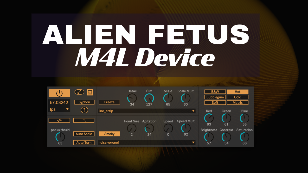| Description: | Alien Fetus – Living Energy from Distant Times Alien Fetus is a Max for Live device designed for audiovisual artists and performers, transforming sound into real-time generative visuals. It features audio-reactive behavior driven by transients and amplitude envelopes, and produces a wide range of procedural graphics—from fluid particles and 3D shapes to smoky, minimalistic forms. With real-time color control, multiple draw modes, Syphon support, and full MIDI mapping, Alien Fetus gives you total control to shape an immersive visual experience, live. |