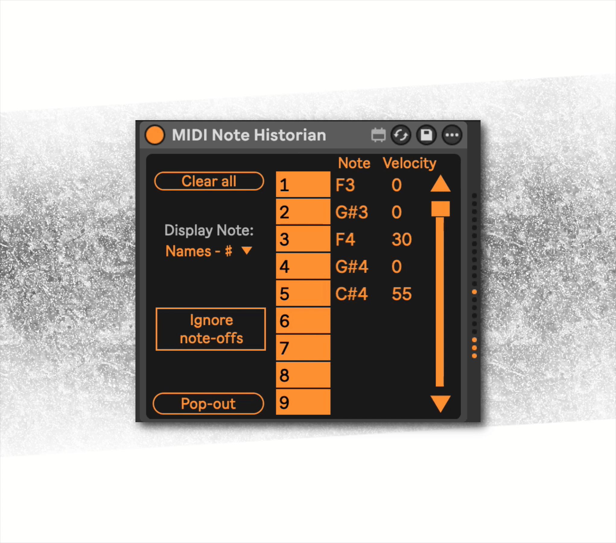 | Description: | Log and display incoming MIDI note data, providing a clear history of your performances. The device tracks note-on and note-off messages, their velocities, and their order of arrival. Demo Video: https://youtu.be/lbJuUtR4yp0 New version available now 1.0.1 - fixed issue where intial state was not set properly and also enabled use of the slider bar. Display The central part of the device features a list that displays MIDI data. When a new note is played, it's assigned to the next available slot in the list. Subsequent hits of that same note are then displayed in the same slot. For example, if the first note to be played is a C3, all future C3s will appear in the slot labeled "1", providing a dedicated history for that specific note. Controls Clear All: Resets the display, clearing all recorded MIDI note history from the list. Note Name / Note Number: This button toggles the format of the displayed notes. You can choose to view them as standard note names (e.g., C#3 or Db3) or as their numerical MIDI values (e.g., 60, 67). Ignore Note-Offs: When activated, the device will only display MIDI note-on messages (velocity > 0). It retains the last velocity for each note, effectively ignoring note-off messages and providing a persistent record of the most recent velocity for a played note. Pop-Out Window: Opens a new, dedicated window that displays all 128 possible MIDI note slots. This provides a comprehensive overview of all incoming MIDI data across the entire range of notes. Close Pop-Out: This button appears on the main device interface when the pop-out window is open. Clicking it closes the pop-out window and returns the display to the original device. Stay On Top: This button is located within the pop-out window. When enabled, it keeps the pop-out window visible and floating on top of the Ableton Live application, even if Live is not the active window. This allows you to monitor MIDI data while interacting with other programs. Play |