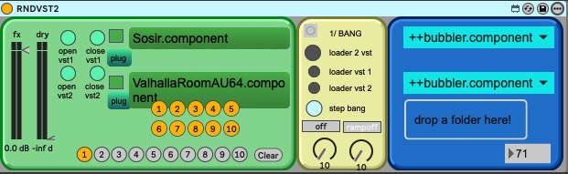Basically, it load 2 vst randomly, and then, you have the possibility to have parameters varying randomly too. The parameters vary suddenly or ramped (excuse my poor english).