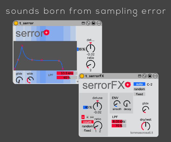 | Description: | Sounds born from sampling error VIDEO DEMO: https://www.youtube.com/watch?v=pHmH1e6JpL0 Sampling a sound at a low sample rate ⏬ creates aliases (replicas of the original sound’s spectrum) at intervals defined by the sample rate, leading to distortion ⚡. In classic redux/resampling effects, the pitch 🎵 of the timbre often changes inconsistently with the original. 👉 Serror devices calculate the input pitch and tune the resampling effect to create harmonic aliases ✨ and reduce non-harmonic distortions ❌. 🎹 serror instrument Starting sound = a sine wave 🌊 → resampled to a sample rate multiple of the input pitch 🎶 → adds harmonics ✨ → richer sound. Parameters: 📈 ADSR graph – sets the dynamic envelope 🎚️ detune – deviation from perfect pitch multiple 📊 detune % – depth of ADSR on detune ➗ ratio – multiplication factor of the new sample rate 🎚️ LPF frequency – low-pass filter cutoff 📊 LPF % – depth of ADSR on LPF cutoff 🎧 wide – stereo width 🌀 glide – time between following notes 🎛️ serrorFX effect Like the instrument, but applied to any input sound 🎤. Pitch can be: 🎵 auto (pitch tracking) 🎲 random (different on each onset) 📌 fixed Parameters: 🎚️ detune / detune % ➗ ratio + ratio mode (count, random, fixed) 🎚️ LPF frequency / LPF % 🌀 glide 🎼 mode (auto, random, fixed) Onset notes 🎹 trigger impacts on filter + detune (if % > 0). 🌊 smooth – softens attack 🕰️ decay – extends tail |