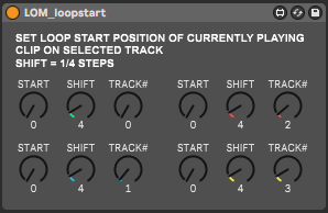 Performance tool that maps "loop start position" to a knob. 4x version with track selector (value 0 = track 1). You can map the knob to MIDI, allowing you scrub through a loop on the fly. Only applies to the currently playing clip of the selected track. Shift amount is in 1/4 steps. |