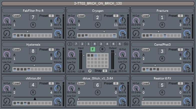| Description: | This is an 8 VST-FX Chain randomizer, kind of like Mr. Matrix from the days of yore. It can hold up to 8 VST effects in a chain, in any automatable order. In the center cell, you can Randomize the chain order and dial in your own chain order (hit the go button to instantiate your chain). Additionally, the chain can be run either forwards or backwards. There is room for 24 Chain Snapshots which can be automated with the Snap numberbox. There is a helpfile next to the Snap box. Each VST slot has low and high cut filters before the effect input (the dry mix is unaffected). The automatable preset number chooses built-in presets of your vst. Each slot has a Snapshot Morpher and Randomizer. Shift+Click on the row of squares (room for 11) to save a Snapshot. Click on a Snapshot to recall it. The automatable Morph slider morphs between the Snapshots stored in the A and B ends of the slider. Change the automatable numbers at the ends of the slider to select the Snapshots loaded there. Share and Enjoy. Unsolicited Math lesson. An 8x8 grid represents 64 possible connection points, each of which can be either on or off (2 states). Consequently, there are 2^64 possible distinct patterns. If you were to analyze one pattern per second it would take nearly 600 billion years to check them all. Furthermore, a large majority of those patterns contain disconnected loops that never make it to the output connection, or don't include all of the devices or contains so much feedback that it immediately explodes. Consequently, this device limits you to the 8! = 40,320 safe connection patterns. With these connections, every device is used exactly once. I tried having a little bit of feedback for each device, but it quickly became terrible. If anybody still wants the full matrix of possibilities, I made it really easy to find it under the hood and add it to your interface. |
