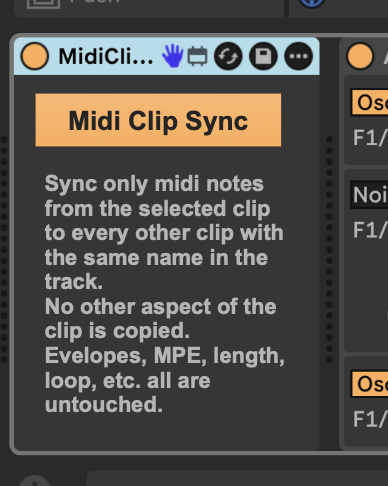 | Description: | Sync only midi notes from the selected clip into every other clip with the same name in the track. No other aspect of the clip is copied. Evelopes, MPE, length, loop, etc. all are untouched. Add the device into your midi track. Select the clip to be used as source. Hit "Midi Clip Sync" All notes will be copied into track's clips with the same name (also works for no named clips). Works in session and arrangement modes individually. |