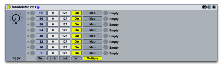 | Description: | The Knobinator is a device in the Maxinator Collection that maps different values on a knob or slider to individual parameters. You could use it, for example, to create a knob that turns on the track activation buttons of a set of tracks as you turn the knob. More info on my web site. |
