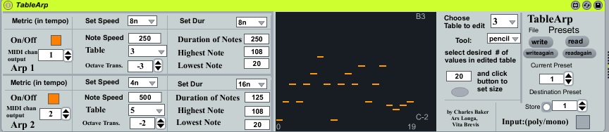 Description: Two Arpeggiators driven by a set of 16 tables, with individual speeds set metrically or not. input can be polyphonic or cycled through monophonically (as in simple note first arp), then that input is transposed by the next value from one of 16 editable tables