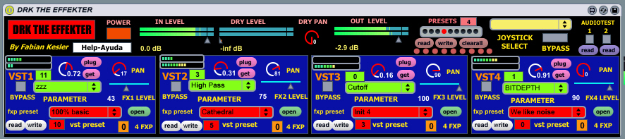 | Description: | DRK THE EFFEKTER IS A REAL TIME PLATTFORM THAT ALLOWS YOU TO PERFORM ALIVE WITH A CHAIN OF 4 PARALEL EFFECTS IN A CREATIVE MANNER. IT WORKS WITH 4 VST EFFECTS TYPE (.DLL) IT IS SUITED FOR JOYSTICK CONTROL, BUT YOU CAN ALSO CONTROL IT BY MOUSE, KEYBOARD, EXTERNAL MIDI OR BY AUTOMATION. PUT ALL THE FILES TOGHETER WITH THE PLUGIN. READ THE DOC INSIDE THE ZIP FOR DETAILS VIDEO: http://youtu.be/ef3_BXkj-mU MORE VIDEOS, HELP, ABLETON TEMPLATE, MAX AND EXE VERSIONS HERE: http://fabiankesler.blogspot.com.ar/p/max-msp.html Author: Fabian Kesler - fvkesler@gmail.com |