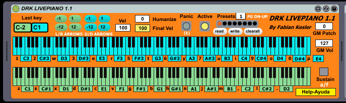 | Description: | New version July 2015. DRK LIVEPIANO is a MIDI piano keyboard emulator with two independent keyboards, one for each hand, from a simple QWERTY computer keyboard. It is useful to play alive, in a situation where you have no MIDI keyboard, or want to play just with your computer to play performance or to record your ideas. With pianistic functions like 2 modes of SUSTAIN emulated pedal and variable playing velocity (humanize mode) NEW IN 1.1 VERSION= - MIDI KEYBOARD MONITOR= NOW YOU CAN ALSO VIEW THE PRESSED KEYS FROM EXTERNAL MIDI KEYBOARD AND-OR FROM ABLETON CLIPS ON THE UPPER KEYBOARD - YOU CAN PLAY AND RECORD WITH THE MOUSE ON THE UPPER KEYBOARD. MIDI VELOCITY CHANGES DEPENDS ON THE ZONE OF THE KEY YOU PRESS. - SOME KEYS RE-ASSIGNED DUE TO FIXED MAPPING ON ABLETON 9.x TO INTERNAL FUNCTIONS (1 instead of q to first ipper piano key, k instead of enter to PANIC) I made this plugin because Live lacks one as plugin, also because the internal Live keyboard in MIDI play mode is not complete for me, and finally to have the features I expected form this kind of device: - The possibility to play different lines with both hands, even different sounds on each (splitting). You have an example of splitting in one of my Live templates - Visual keyboard - The possibility to choose the notes every key plays, so you can build your own scales, octave settings or modes and store them as presets. - Basis (fixed) velocity and randomness (custom depth) to humanize it. - Sustain pedal fixed and temporary VIDEO: http://youtu.be/trFwLKg616I MORE VIDEOS, HELP, ABLETON TEMPLATE, MAX AND STAND ALONE (MAC-WIN) VERSIONS HERE: http://fabiankesler.blogspot.com.ar/p/max-msp.html Author: Fabian Kesler - fvkesler@gmail.com |