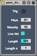 Works with my Perc trig 2. Receives a bang and live velocity from an audio signal to trig a selectable midi note. You can choose pitch, length for the note and you can toggle between fixed velocity / live velocity. |