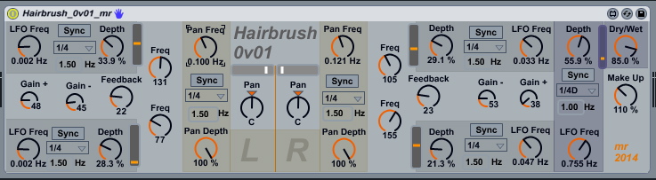 | Description: | This is Comber on steroids. There are now four comb filters, with additional gain controls, and the Wet/Dry mix control is now also controlled by an LFO. Set up a sequence, add a bit of Ping Pong Echo, get those LFOs set to different frequencies, and let it all wash over you... But seriously, take car with the gain, and it is best to add a Limiter afterwards in the audio chain (at least until I add one (plus an LFO, obviously!)) |