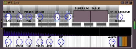 | Description: | IFS : Inverse Fourier Synthesizer. I often ask myself, like everyone,what's the real benefit of digital vs analogue. analogue oscillators and filters sound way so much better,and i personally prefer using them.so what can dsp give you other than controlling/sequencing or infinitely complex and useless "modular" machines? The Fourier transform of course, so i tried with a personal approach... The signal can have all the harmonics you want at the cost of only the pfft. The harmonic content is given by the series Fi= {[(q)^(i*2N)]/e}*(-1(M))^i M is a LFO wich you can control by one button. It's a leibniz/geometric series with some changes. I've put some controls and am willing to give out the source if someone wants to edit it himself. Future versions: 1.0 total monome64 + arc2 support with built in sequencer and parameter edit for each step (instead of changing the global parameter ,the parameters may will be changed for every step) , an other adsr for a spectral envelope. 2.0* in some future: OSC based communication for solving the series on an other computer (preferably trough SuperCollider) so max resolves only the fft.this also implies the choice of any series imaginable. NOTES: 1) this works with a 4096 fft with simple phase computing.even if it doesn't bother much a better algorithm is needed. 2) the LP and HP are fft filters,not classic pole filters. 3) This is my personal project , anyone willing to help is welcomed, if you don't like it don't use it. Enjoy. A.K. |