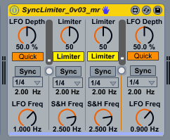 SyncLimiter is an audio effect that has two independent limiters whose thresholds and compression ratios can be modulated by sample-and-hold captured sine waveforms from two independent synch-able LFOs.
