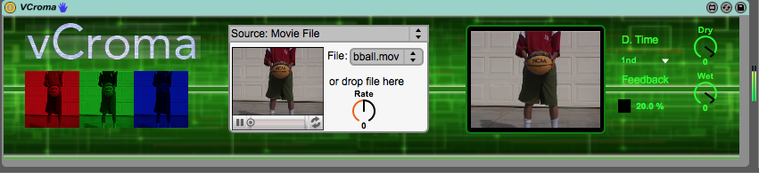 vCroma is a converter device from RGB scale to sound frequencies. The user can translate the RGB variations of a video file to sound. You can select between three sources.A)video file, B) Video noise or Color, C) a Camera Input. The Dry/Wet feature offers a delay/reverb processing of the sound, the user can adjust delay time and feedback. The vCroma is an instrument device, the user can mute the device via C3 note in Ableton Live piano roll, any other note sends signal to Ableton output. |