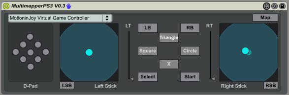 | Description: | The PS3 equivalent of my MultimapperXBOX360 device. Control Live's parameters with a PS3 controller. Windows users might have to install drivers from http://www.motioninjoy.com/wiki/en/install I have no clue about Mac versions. Known issues: The motion sensor interferes with the right stick. direction buttons not yet mappable. Credits: Gavin Jones www.oftd.co.uk/blog/ |