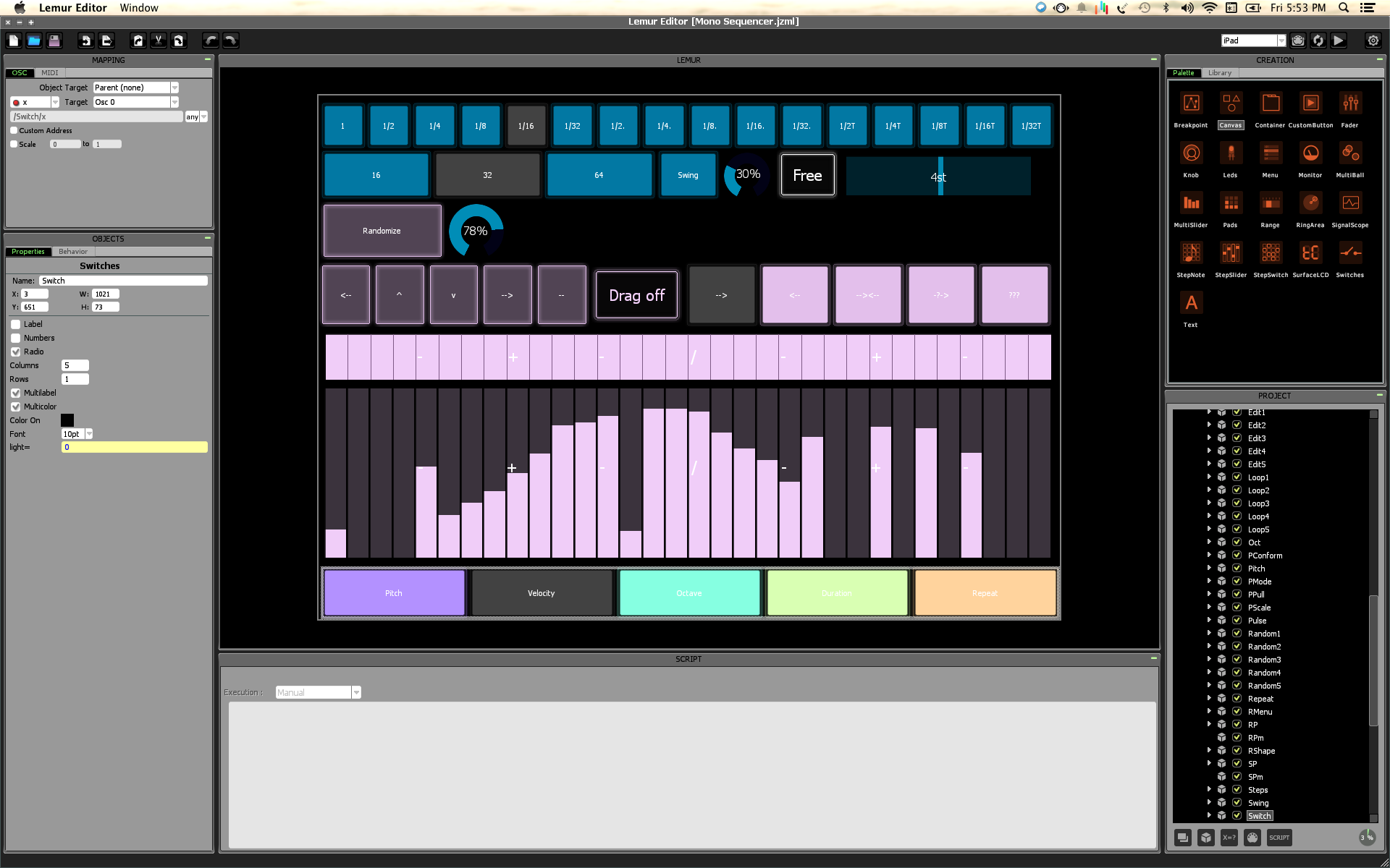 | Description: | A lemur layout (more ipad) that connects via OSC to the edited Mono Sequencer patch that is a Max for Live essentials. Made it for a friend, it is fun! Works well, I'm sure there are other versions out there, here is another one! I did pretty much everything... haha. Download link has more description more of my stuff: cargocollective.com/integrate |
