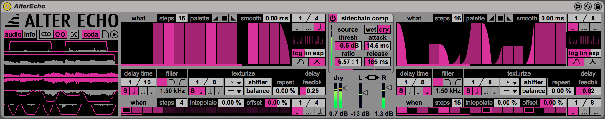 | Description: | DELAY, AND BEYOND In short: Alter Echo is a super delay. What does a super delay do? Well, it delays signals with incredible accurate tools, and it offers a set of crazy manipulation parameters. That's Alter Echo! Alter Echo is the most creative delay you can use in Ableton Live. Thanks to a wide range of parameters in four sections: what sequencer, texturize, when sequencer, and side-chain compressor. It does great job as classic delay, and it brings a lot of innovative uses! Alter Echo lets you delay a signal, exactly how you want. Then, it goes beyond and it lets you shape the delayed signal with exclusive advanced features. This delay effect will take your sound to a next level, into unexplored textural vibrations, complex accents configurations, continuously moving rhythms, and more! Check the video overview below to know more about the structure of this new incredible device. Sound design by Ivo Ivanov of Glitchmachines, Richard Devine, Afro DJ Mac, Piezo, and K-Devices. |