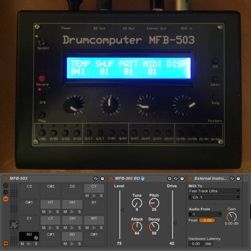 This device is the first version of a drum rack containing multiple Max For Live and routing devices to control and sequence a Drumcomputer MFB-503 (http://www.mfberlin.de/Produkte/Musikelektronik/MFB-503/MFB-503e/mfb-503e.html) via Midi.