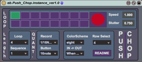 | Description: | This is a 4 channel Looper/chopper for the Ableton Push hardware (with a MIDI mappable button for use with a foot controller for us instrumentalist). Vari-speed recording/overdubbing (thanks to the great karma~ external in version 1.1 and up), and some versatile play back controls create a unique performance and production tool. If using Windows, you will need to download the karma~ external and place it in your max search path. Downolad it here: http://www.rodrigoconstanzo.com/2015/05/karma/ There is documentation included in the device that details how you use the Push to record and manipulate audio. See a quick video of it in action here: https://youtu.be/iygXp-a-410 See some Live instrument input here: https://youtu.befXB-t6-JIvA |
