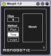 | Description: | Morph creates a number of transition clips between two existing MIDI clips. Morph requires a MIDI clip to be highlighted in Live's Session View with a second 'target' clip in the slot directly below it. The number of new transition clips can be set by the user and different methods of morphing allow for different results. |