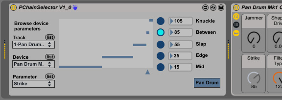 | Description: | PChainSelector V1.0 This device was primarily designed for selecting the playing style (mid, edge slap, between, knuckle) by relative probability of the Pan Drum (Live Pack, Soniccouture). At each incoming midi note (see screenshot) a random number between 0 and 100 is generated (arrow below the multislider) and the corresponding chain (mid, edge slap, between, knuckle) set by the multislider is used. The Strike dial controls the chain selector of the Pan Drum. You can use this also for other chain selectors or parameters of other instruments. By clicking the Pan Drum button the device will change in a generic mode. You can manualy adapt the five outputs to the parameter of your choice. This generic mode is applied when you load the device. |