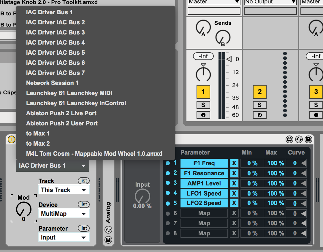 | Description: | This patch captures the mod wheel value, and lets you assign it to a parameter within live. To use, drop it on a MIDI track and click the refresh button. Select your MIDI device from the drop down menu, then use the assignment drop down menus to choose a parameter. Make sure you have your track armed. Assign this to the input of a Multi Map if you want the mode wheel to control more than one parameter. |
