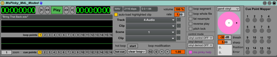 | Description: | This is just a mild modification to the Ms. Pinky device. It provides MIDI mapping for individual cue points allowing the cue selector to operate like individual buttons, and therefore, each cue point can have it's own individual button control. YOU NEED TO OWN MS. PINKY IN ORDER FOR THIS DEVICE TO WORK. This device was modified with Ableton & Max 64-bit. I tested it with a MIDI Fighter 3d and the MPK49 keyboard and drum pads. |