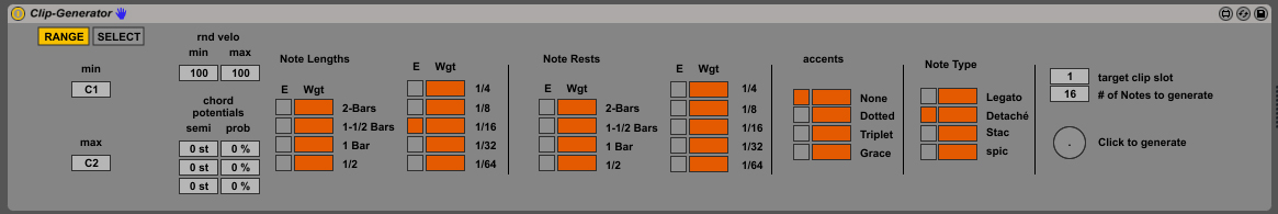 | Description: | ***Bugfix*** 2/9/16 1/32 and 1/64 note lengths are no longer drawn as rests. Clip-Generator generates midi clips for musical purposes. It is based off of work found in user Adphi's Step Recorder device found here: http://www.maxforlive.com/library/device/3421/step-recorder You can set potential notes to be generated using a range of notes, or you can enable and select up to 8 notes. (Red circle toggles allow you to input notes from your midi controller/keyboard) Toggles enable things. Orange sliders set the weight (possibility) for things to occur. If a toggle is disabled, that parameter will not occur and is not included in any weighting. You can set a min/max random velocity range, or set both to the same value to have constant velocity. You can also set up to 3 chord potentials in semitones and the probability in percent that they will occur. Chords are based off the root note that is originally generated. Chords can and will occur at the same time depending on your probability settings. Note lengths and note rests are all weighted together. Example: 1/4 note length is enabled with orange slider at max and a 1/2 note rest is enabled with orange slider set to max. There is an equal chance that either a 1/4 note length or 1/2 note rest will occur. If you decrease the 1/4 note length orange slider, there is less chance that the 1/4 note length will occur. Note accents and note types function the same way, but are each independent. Finally, set the clip slot you wish to generate your clip in. Set the number of notes you wish to generate. Press the big button. Depending on how many notes you generate, there is a good chance notes will be generated well outside the clips default loop brackets. Adjust these brackets to taste. Worth noting, if you write a clip to clip slot 2 for example, and then write again to clip slot 2, the original clip will be completely overwritten. For extra fun, apply a scale from Live's Midi Effects! Trick your friends and family into thinking you're a virtuoso!!! Demo videos: https://www.youtube.com/watch?v=UOtEz-zEOOs&feature=youtu.be https://www.youtube.com/watch?v=sIjZkMhtw94&feature=youtu.be |