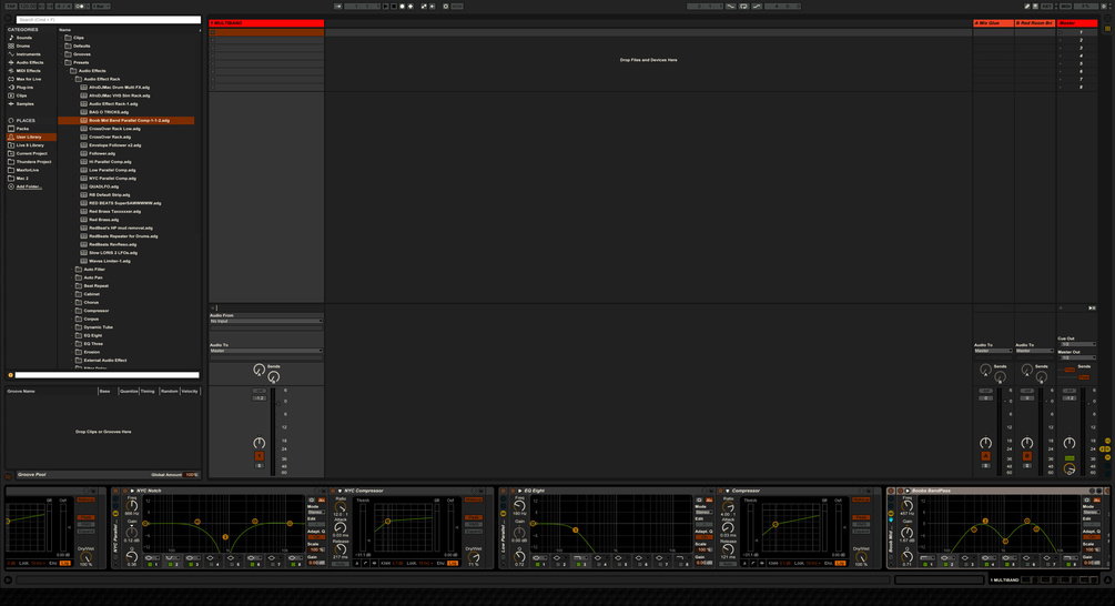 | Description: | Cygnus Red MultiBand Compression Pack for Ableton This pack contains 4 Ableton Live multiband/dynamic range Audio Effect Racks consisting of Live's EQ Eight and Compressor. There are High/Low/NYC Notch/BandPass Racks already dialed in and ready to go. Dynamic range compression (DRC) or simply compression reduces the volume of loud sounds or amplifies quiet sounds by narrowing or "compressing" an audio signal's dynamic range. Compression is commonly used in sound recording and reproduction and broadcasting and on instrument amplifiers. Audio compression reduces loud sounds which are above a certain threshold while quiet sounds remain unaffected. The dedicated electronic hardware unit or audio software used to apply compression is called a compressor. In recorded and live music, compression parameters may be adjusted by an audio engineer to change the way the effect sounds. Downward compression reduces loud sounds over a certain threshold while quiet sounds remain unaffected. Upward compression increases the loudness of sounds below a threshold while leaving louder passages unchanged. Both downward and upward compression reduce the dynamic range of an audio signal. An expander performs the opposite function, increasing the dynamic range of the audio signal. Expanders are generally used to make quiet sounds even quieter by reducing the level of an audio signal that falls below a set threshold level. A noise gate is a type of expander. |