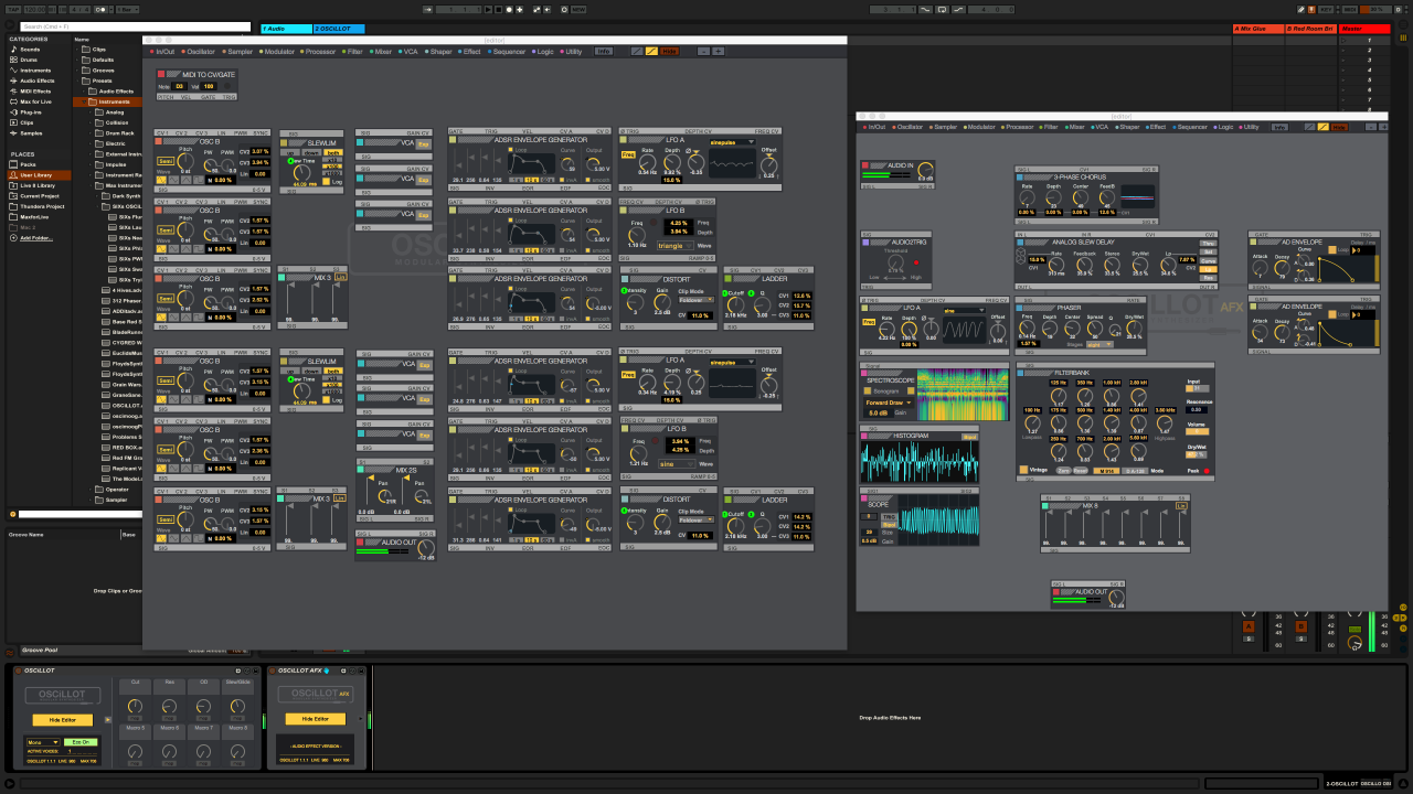 | Description: | SIXs Synth/Effects Unit for OSCiLLOT SIXs is a monophonic modular synthesizer for OSCiLLOT/Ableton Live inspired by the classic Moog modular synthesizers. It comes with 7 patches and a modular Effects Unit. http://cygnusred.tumblr.com/post/138914461845/the-oscillot-build-blog http://cygnusred.tumblr.com/post/140132955990/the-oscillot-build-blog-part-ii |