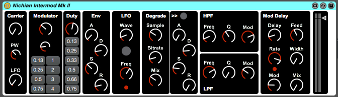 | Description: | This device relies on inter-modulation between two oscillators to create interesting timbres. It starts off quite plain but adjusting the modulator and duty cycle to non-even multiples produces unusual textures. The envelope and mix control on the degrader can be used to create more detail. And then there's a modulated delay with a pretty budget sort of stereo widening thing. No particular theory has been used in the construction of this, more a case of just seeing what Max will let me get away with. Enjoy. |