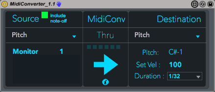 | Description: | Original device by animatek here: http://www.maxforlive.com/library/device/2360/midiconverter Features: Midi Converter allow to convert any Midi Parameter: I saw a request for removing note off from velocity conversion. I wanted that feature as well so I modified the device to add a switch to filter out MIDI note off messages to allow better mapping to control parameters that you want to remain set until you send another converted velocity message. |