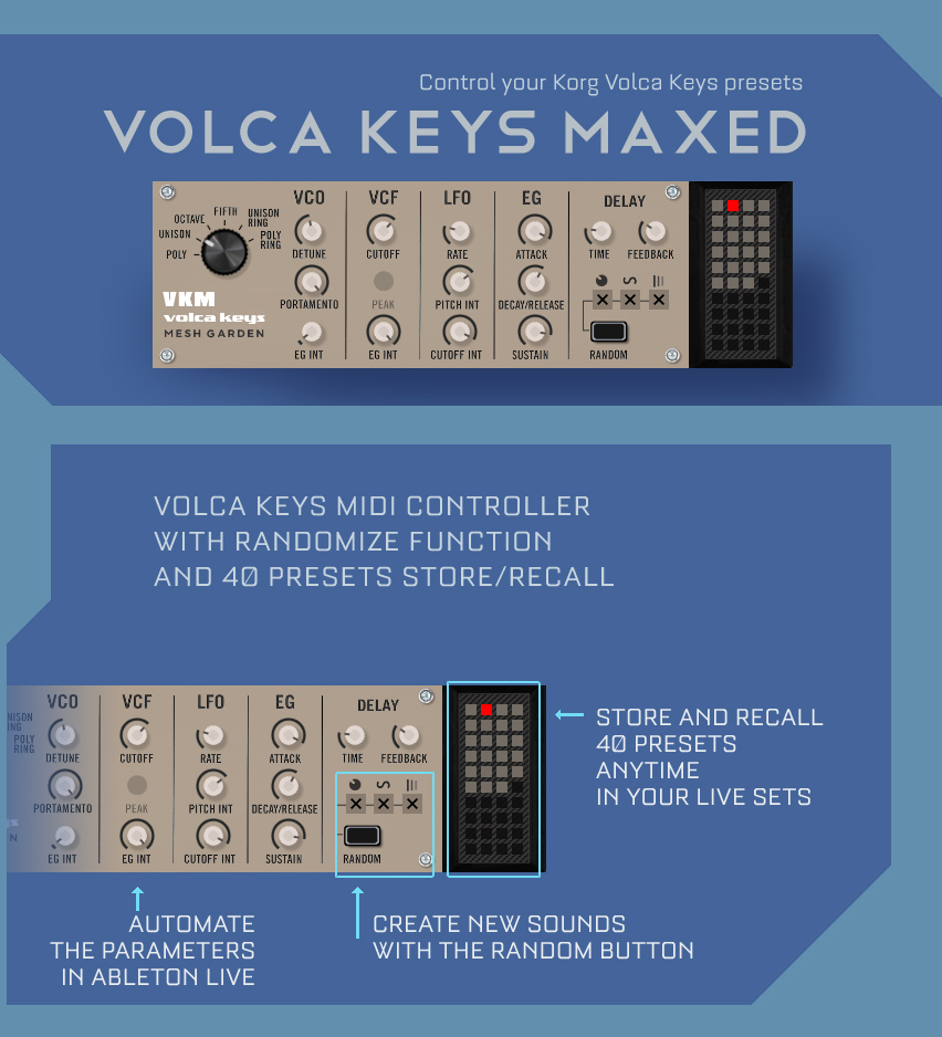 | Description: | Volca Keys Maxed is a midi controller for the Korg Volca Keys synth. With it you can control, automate, randomize, store and recall your Volca Keys sound presets. Featuring: - 40 storable presets - Random function with selectable zones to create sounds with a single click - All parameters are midi mappable and mapped to Push knobs |