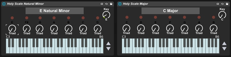 | Description: | Press one key, get a chord in return. One device for all Major scales, and one or all Minor Scales. I have also added some ableton device patches for each scale, because why not. In my pursuit of making a better version of the Holy Scale racks made by 8 bit bandit (https://www.ableton.com/en/blog/holy-scale-chord-progression-rack-8bitbandit/) I decided to recreate it in Max 4 Live. You can find more info on my github, where I have uploaded the project and code. https://github.com/DJSymBiotiX/Holy-Scale-M4L |