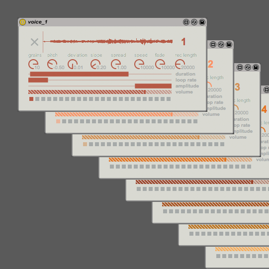 | Description: | grainfields turns your 128 grid into a granular synthesizer with 8 voices - each with up to 10 constant streaming grains. Modulate grain parameters (pitch, duration, loop rate, position etc.) of each voice to create a large variety of interesting timbres and textures. Record and loop pattern gestures to create rythmic and melodic sequences. Getting started Before launching the grainfields Max for Live device make sure that your grid is connected. 1st step in Ableton is to drop 'grainfields_master.amxd' on an empty track. This device establishes the osc connection with monome (and Lemur on iPad). Show/hide osc settings with the toggle at the bottom of the device. Your monome should auto-detect. 2nd step is to drop 'voice_1.amxd', 'voice_2.amxd', 'voice_3.amxd' (...and so on) on separate audio tracks. When a new voice m4l device is loaded on an audio track in Ableton, the device will automatically activate the corresponding lights on your monome grid. If you only need e.g. 3 voices then load 'voice_1', 'voice_2', and 'voice_3'. You don't need to load all voices. Video demo: https://vimeo.com/190278719 grainfields is also available as a standalone app for monome - more info on: http://kasperskov.dk/projects_MonomeGrainfields.html Created by Kasper Fangel Skov 2016 |