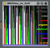 Display MIDI Messages using colour for different types of message. Useful visualisation when working with complex sounds or MIDI processing. |