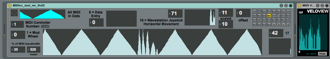 | Description: | This tool allows analysis of the values produced by the 'MIDI_cc' MIDI Controller simulator, and has lots of scrolling displays that provide plots of values over time. These are the same type of display as I used in the Mode Audio VeloView MIDI Velocity viewer that I've included on the right hand side of the screen-shot. The main scrolling display allows the selection of the MIDI Continuous Controller Number, whilst there are separate scrolling displays for Data Entry (Controller Number 6) and Number 16. At the far right hand side there are some buttons and other controls for another M4L device which is in the pipeline... Unlike the MIDIcc utility, this is much more a draft tool for my own use, and it isn't intended for casual users. I may tidy it up some more when I reach the fabled point where I have some free time. |