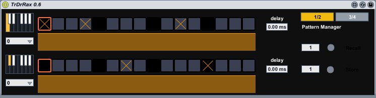Description: | A trx0x style step sequencer for drum racks. At the moment it supports 4 pads, but you can switch which ones, & split your racks across several tracks (provides more fun with pattern switching...). Features : - 16 steps drum sequencer - Velocity sequencer - Key switch across 5 octaves - Midi delay up to 1 sec on each track - Ability to store and recall up to 100 patterns - Pattern selection midi mappable - Control the 24 first patterns via notes (C3 to B4) Fixed in 0.6.3 : On live set reload, the device would remember the last played pattern but wouldn't load it |